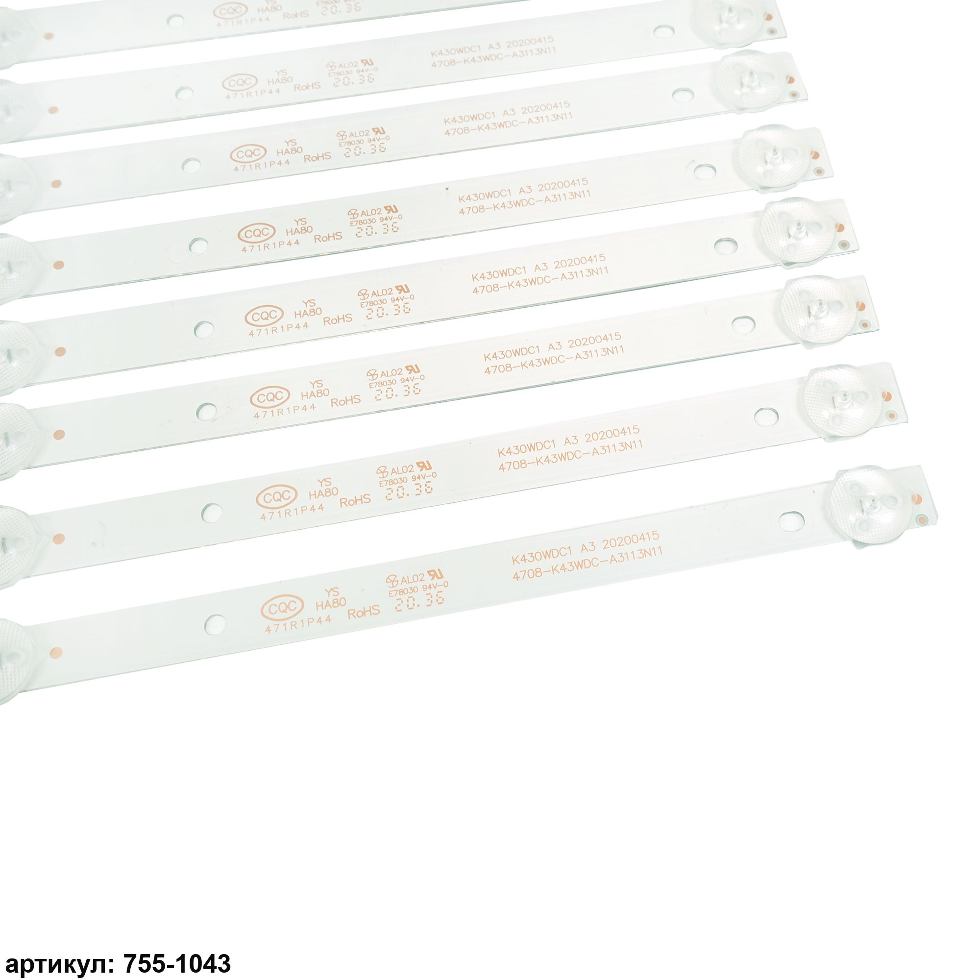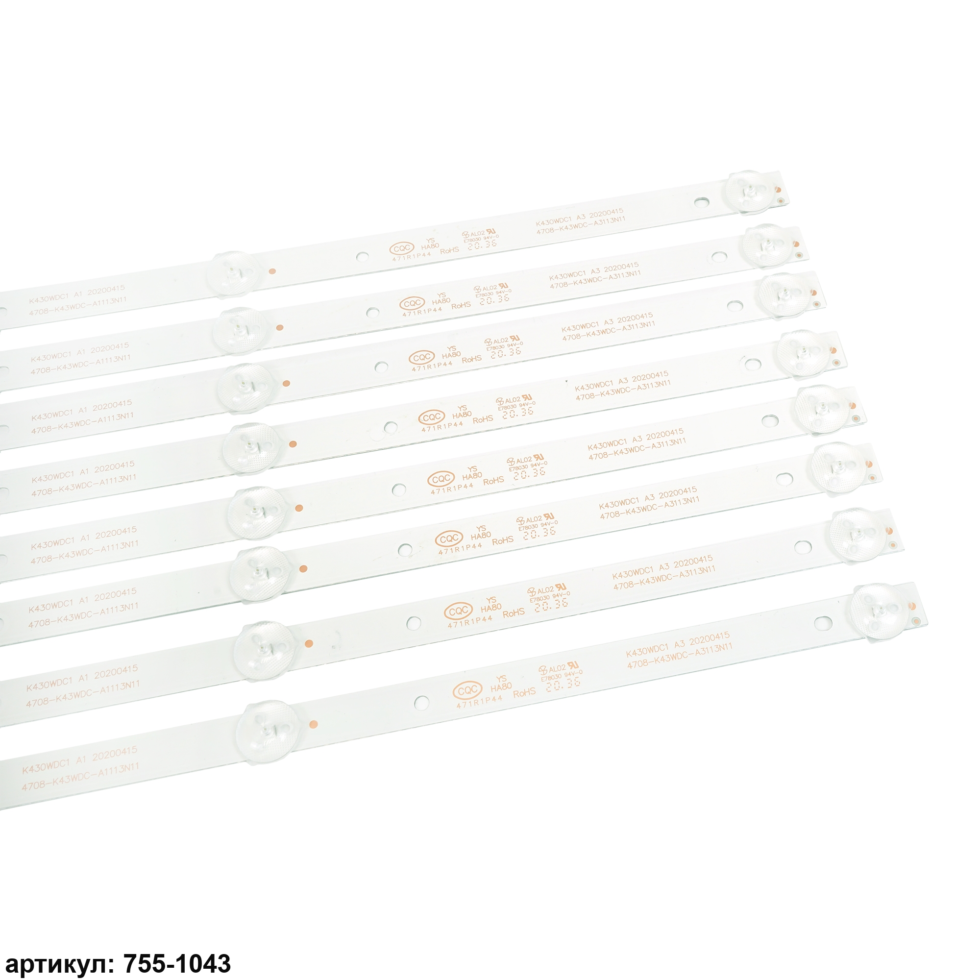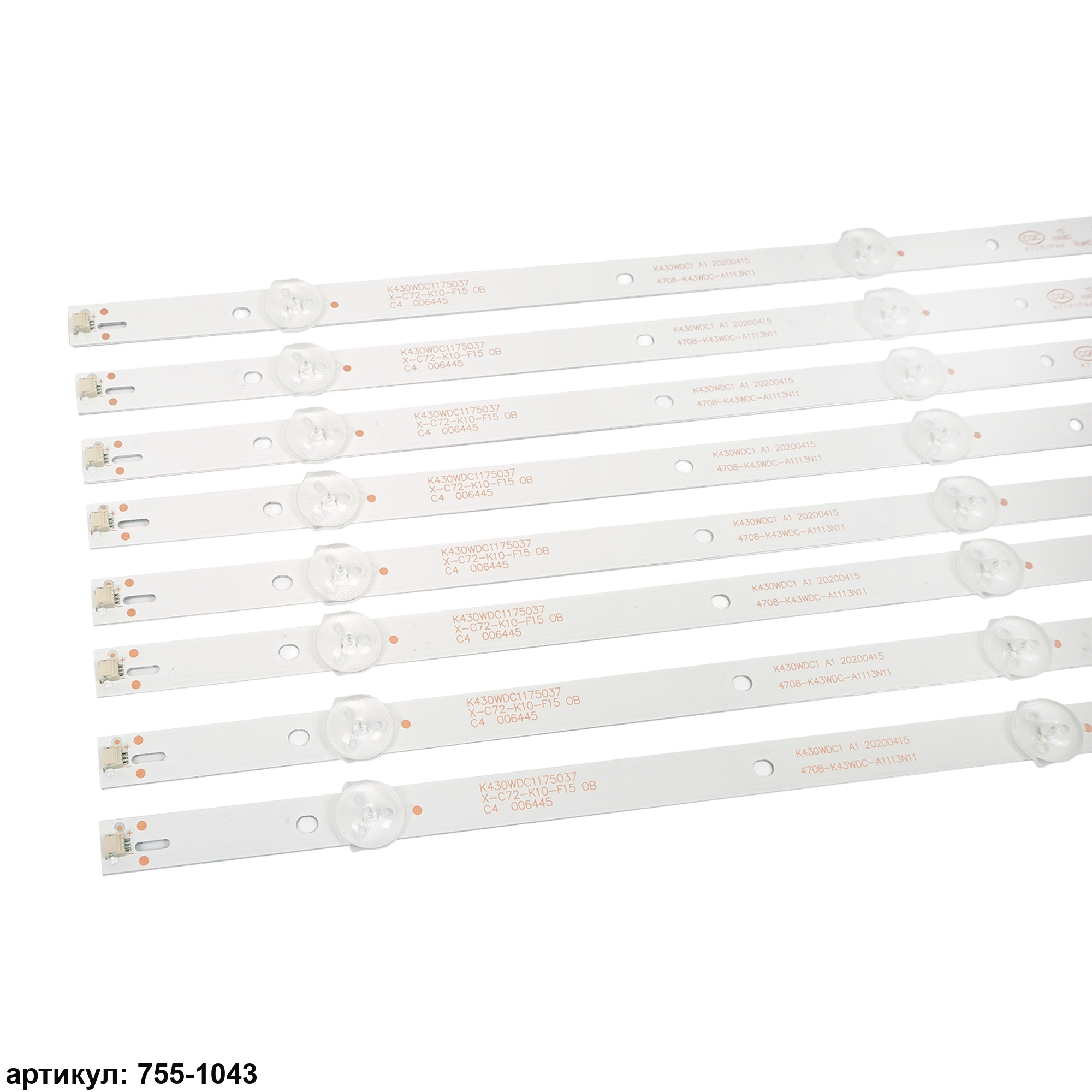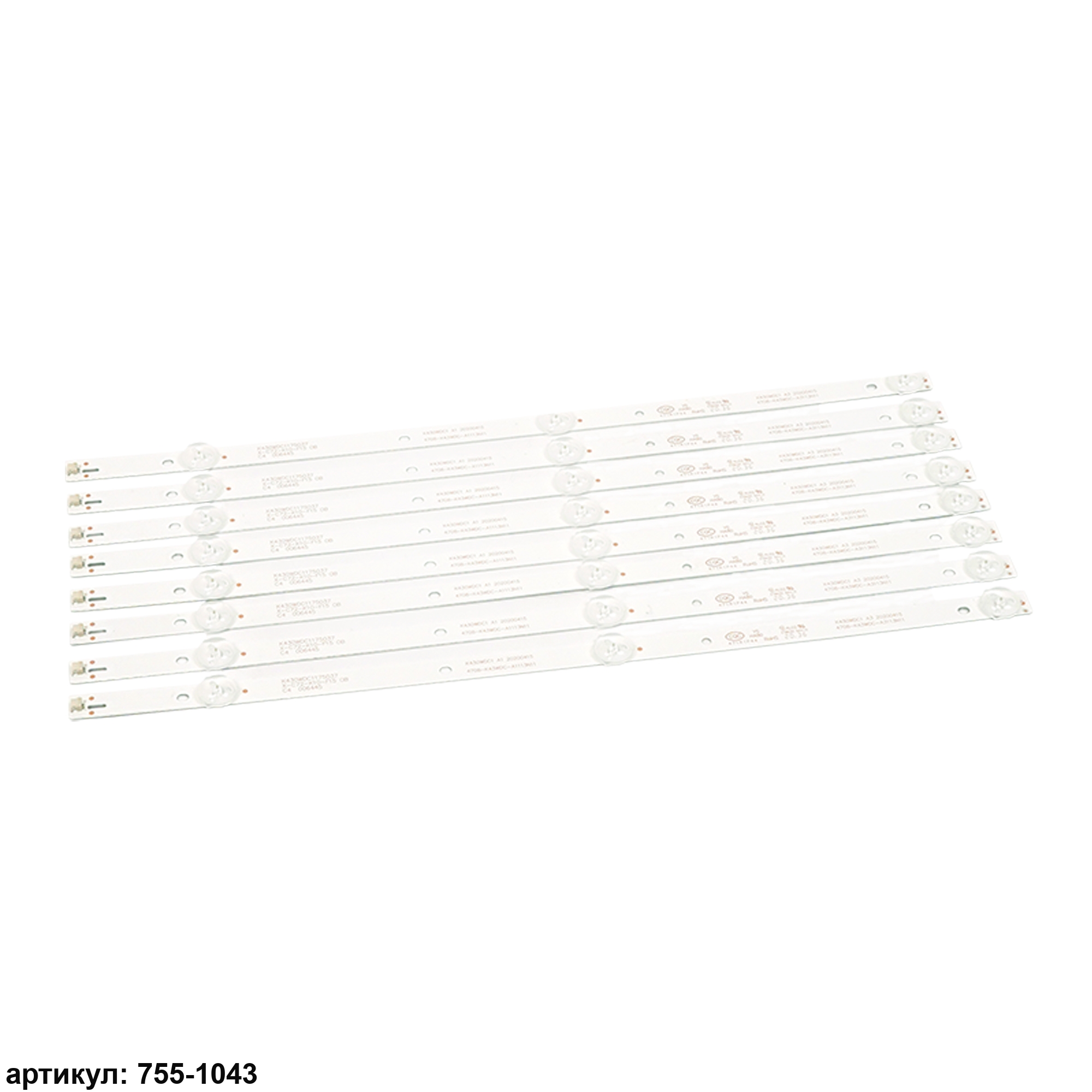 Комплект планок светодиодной подсветки для телевизора Philips 43' / (3 led 6V 389mm) Комплект включает в себя: - 8 планок 4708-K43WDC-A1113N11Совместимые p/n: K430WDC1 А1, K430WDC1 А3, K430WDC1175037 Подходит для моделей телевизора: Philips 43PFS4012, 43PFS4012/12, 43PFF3012, 43PFF3012/T3, 43PFF5012, 43PFF5012/T3, 43DL4012N, 43DL4012N/62; AOC LE43M3570, LE43M3570/60, LE43M3579, LE43M3579/60, 43M3083, 43M3083/60S; Changhong 43Y3000H; Dahua DH-LM43-F200; TCL Y43G1B, L43E6800