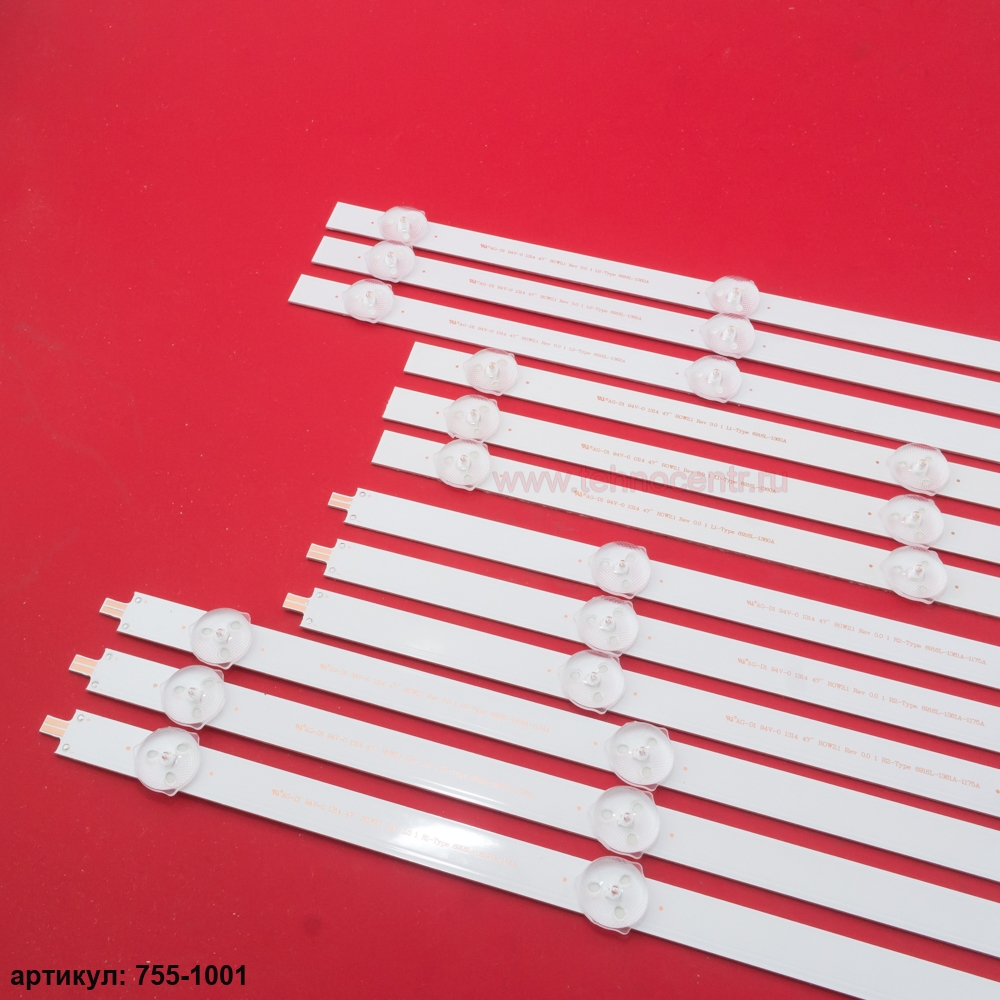 Комплект планок (12 шт) 3L1+3R1+3L2+3R2 светодиодной подсветки для телевизора LG 47' / (R/L 9 led 3V 940mm)Комплект включает в себя:- 3 планки L1 (47' ROW2.1 Rev0.7 L1-Type, 6916L-1176A)- 3 планки R1 (47' ROW2.1 Rev0.7 R1-Type, 6916L-1174A)- 3 планки L2 (47' ROW2.1 Rev0.7 L2-Type, 6916L-1177A)- 3 планки R2 (47' ROW2.1 Rev0.7 R2-Type, 6916L-1175A)Совместимые p/n: 6916L-1120A, 6916L-1121A, 6916L-1122A, 6916L-1123A, 6916L-1174A, 6916L-1175A, 6916L-1176A, 6916L-1177A, 6916L-1359A, 6916L-1360A, 6916L-1361A, 6916L-1362AПодходит для моделей телевизора: LG 47LA6200, 47LN5400, 47LN5700, 47LN5200, 47LP360, 47LN540S, 47LN519C, 47LN613S...