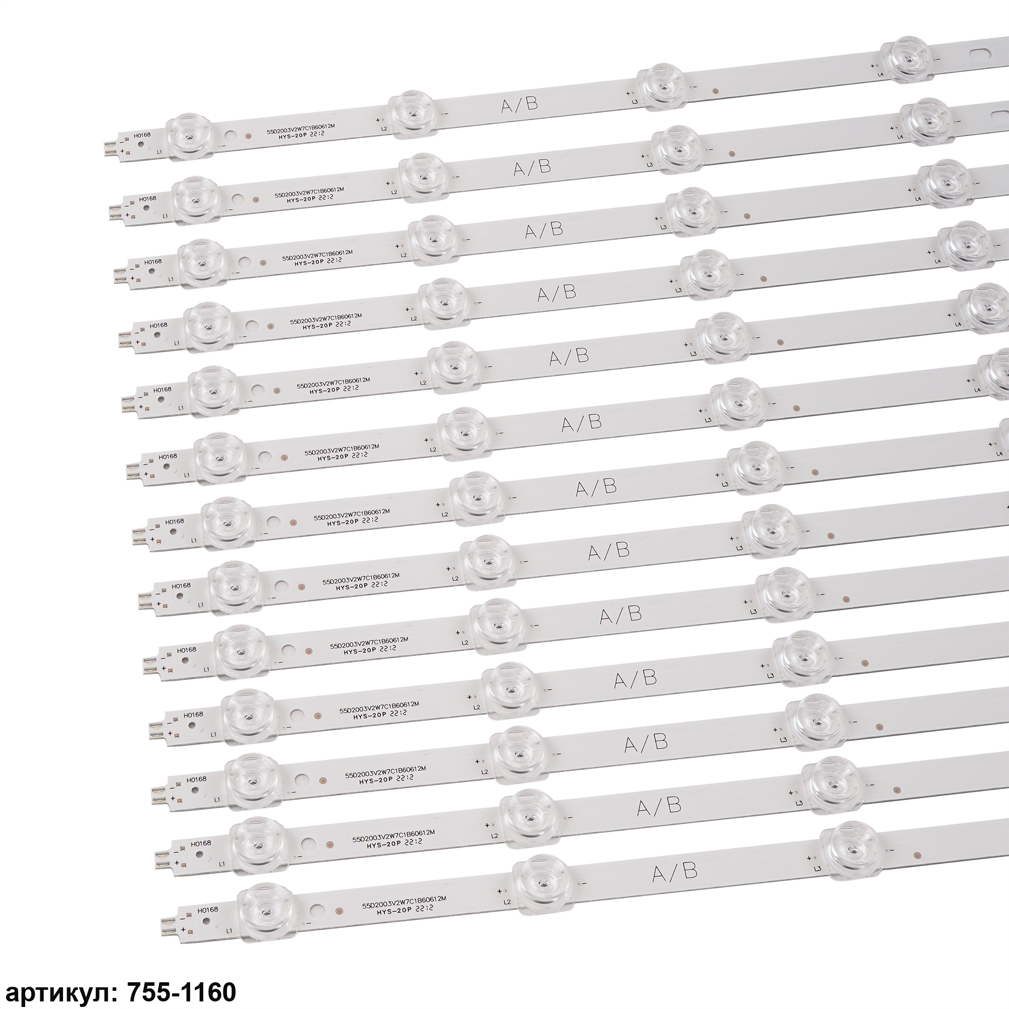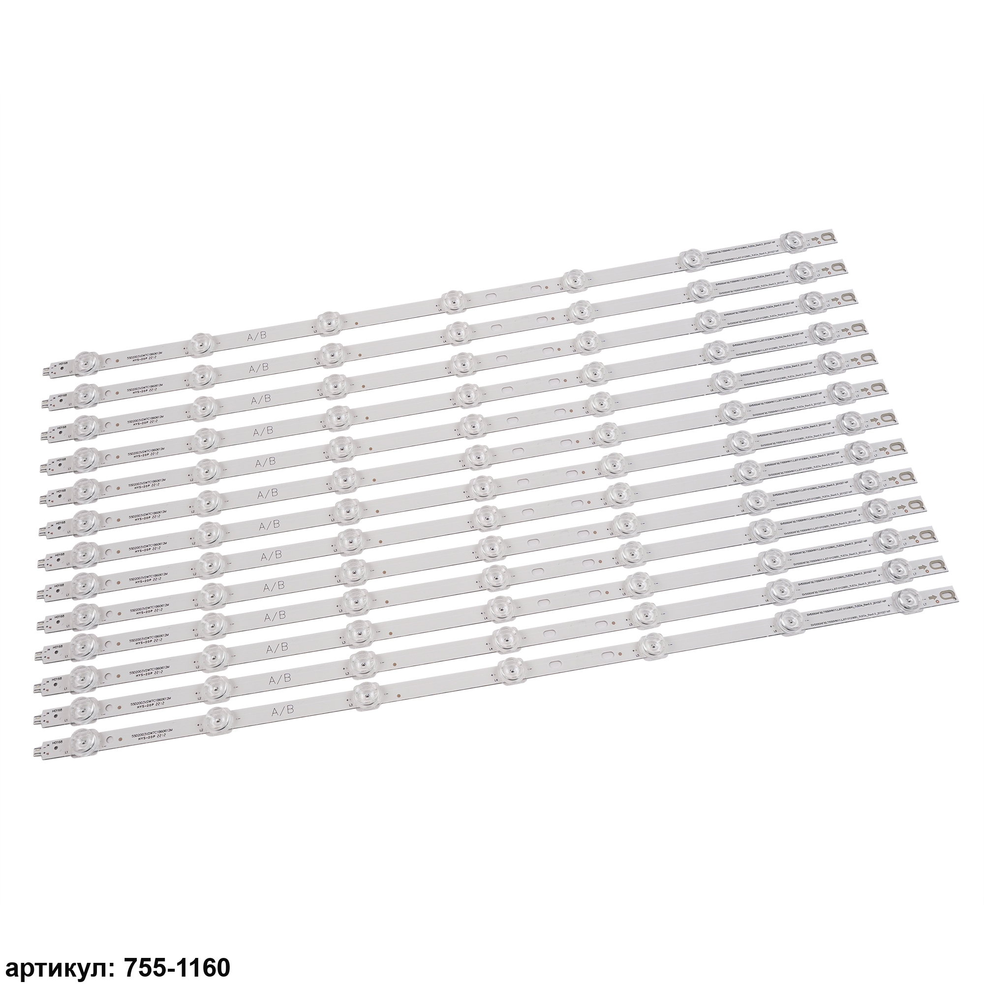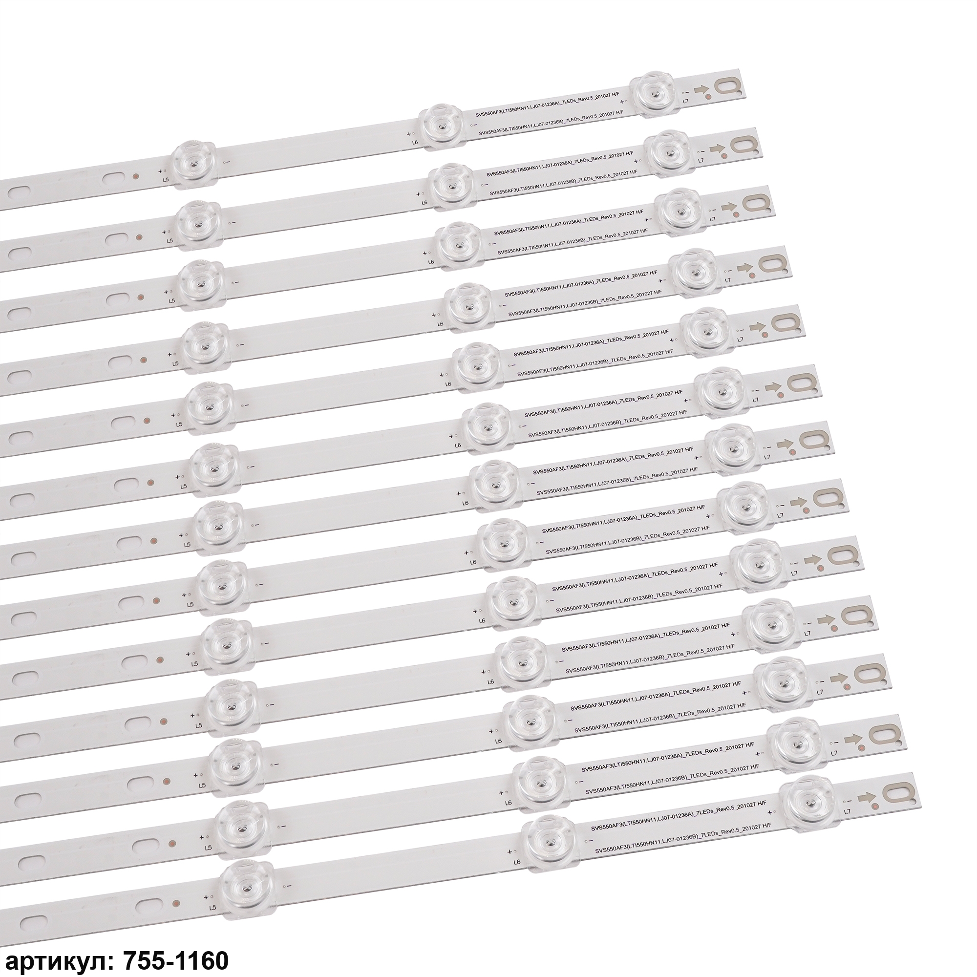 Комплект планок светодиодной подсветки для телевизора Samsung 55' / (7 led 3V 606mm) Комплект включает в себя: - 13 планок LJ07-01236A/BСовместимые p/n: SVS550AF3, LJ07-01236A, LJ07-01236BПодходит для моделей телевизора: Samsung LTI550HN11, LH55UDEBLBB, LH55UDEBLBB/XF