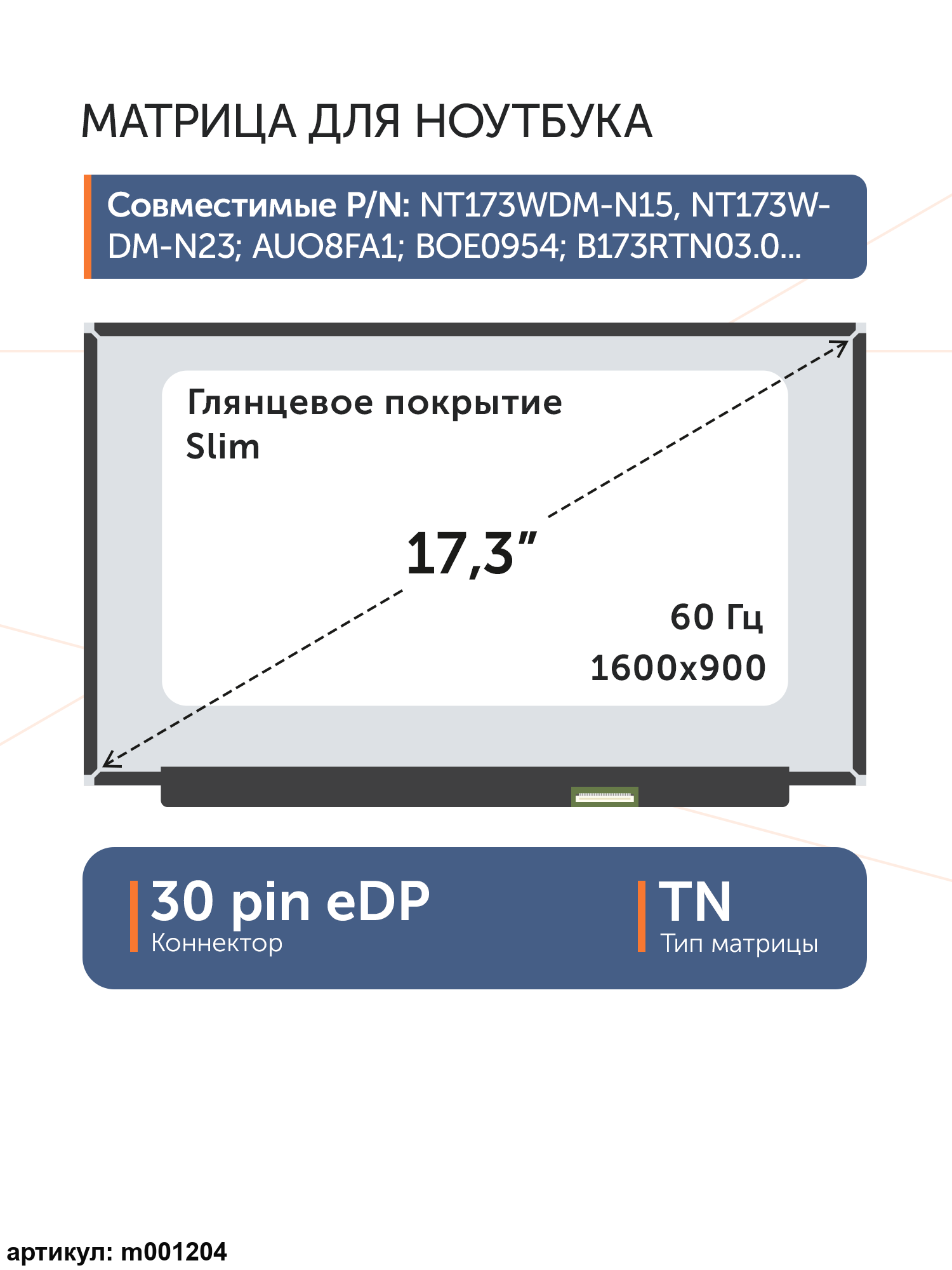 Совместимые модели: NT173WDM-N15, NT173WDM-N24, B173RTN03.1, B173RTN03.0, NT173WDM-N25, NT173WDM-N23