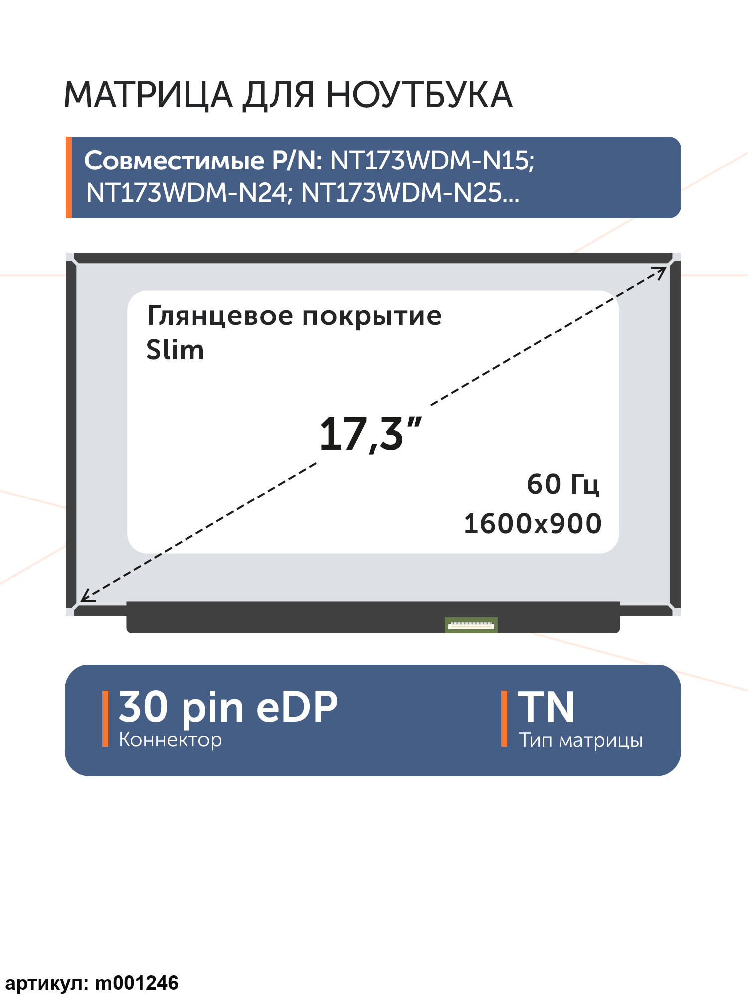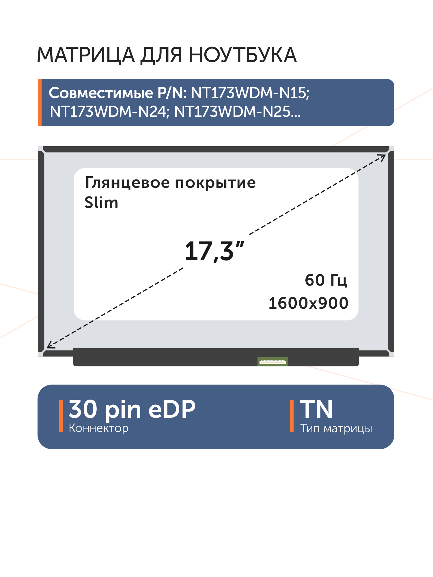 Совместимые модели: NT173WDM-N15, NT173WDM-N24, B173RTN03.1, B173RTN03.0, NT173WDM-N25, NT173WDM-N23