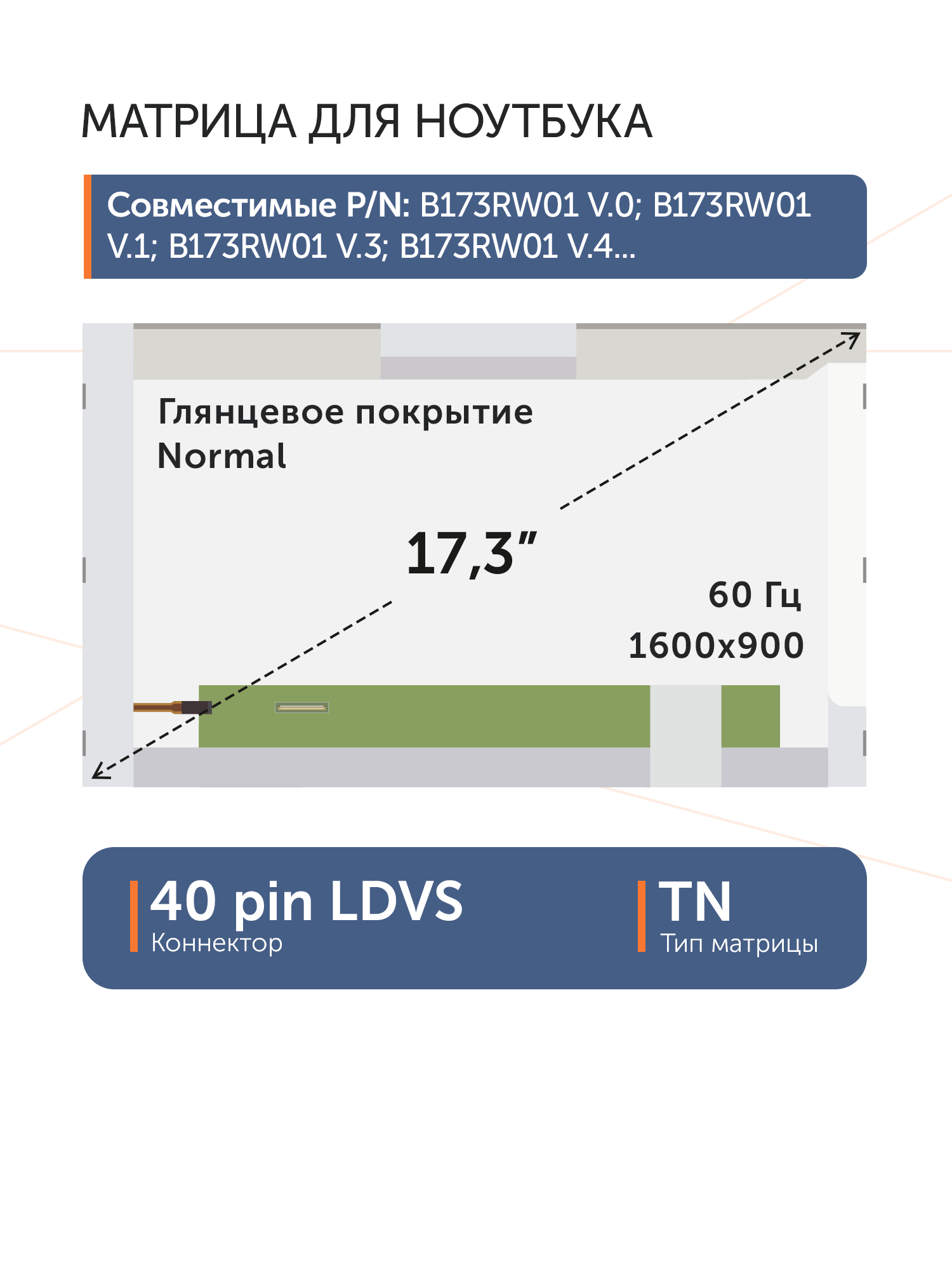 Совместимые модели: B173RW01 V.0, B173RW01 V.1, B173RW01 V.3, B173RW01 V.4, B173RW01 V.5, CLAA173UA01, LP173WD1 (TL)(A1), LP173WD1 (TL)(A2), LP173WD1 (TL)(A3), LTN173KT01, N173O6-L02, N173O6-L03, N173FGE-L21, LP173WD1 (TL)(C3), LP173WD1 (TL)(E1), LP173WD1 (TL)(N2), N173FGE-L23, N173FGE-L23 Rev.C1, LP173WD1 (TL)(N1), N17306-L02 Rev.C3, LTN173KT02, LP173WD1-TLA1, LP173WD1-TLA2, LP173WD1-TLA3, LP173WD1-TLC3, LP173WD1-TLE1, LP173WD1-TLN2, LP173WD1-TLN1, LTN173KT03, LTN173KR01, LP173WD1-TLP3, LP173WD1 (TL)(P3), LP173WD1 (TL)(C4), LP173WD1-TLC4, LP173WD1 (TL)(G1), LP173WD1-TLG1, N173FGE-L13 Rev.C3, N173FGE-L23 Rev.C2, LP173WD1 (TL)(H8), LP173WD1-TLH8, N173FGE-L63 Rev.C2, LP173WD1 (TL)(F1), LP173WD1-TLF1, LP173WD1 (TL)(C1), LP173WD1-TLC1, LTN173KT02-T01, B173RW01 V.1, B173RW01 V.2