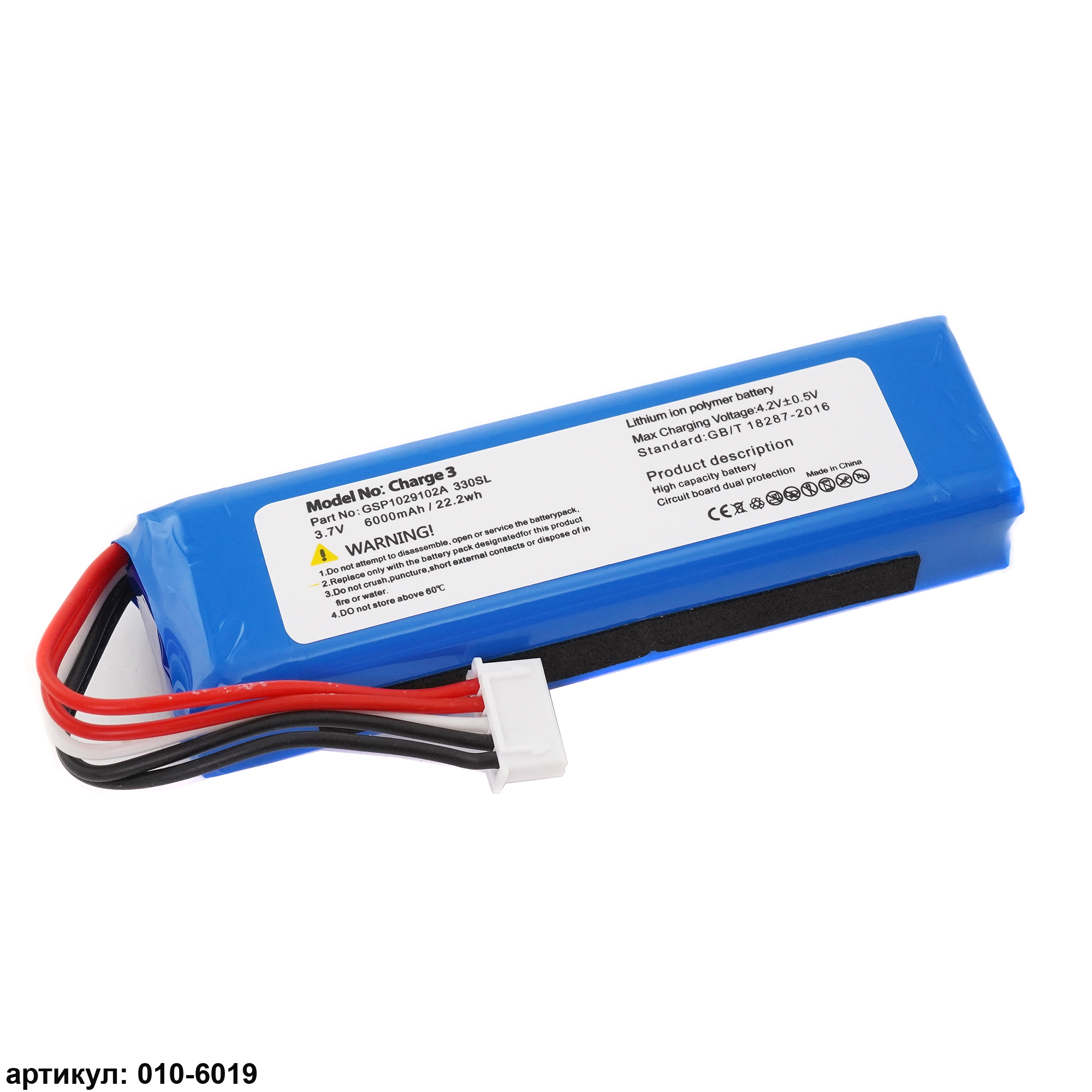 Подходит к колонкам: JBL Charge 3 обратная полярность (2016 г.) 3.7V 6000mAhСовместимые p/n: GSP1029102A, CS-JML330SL
