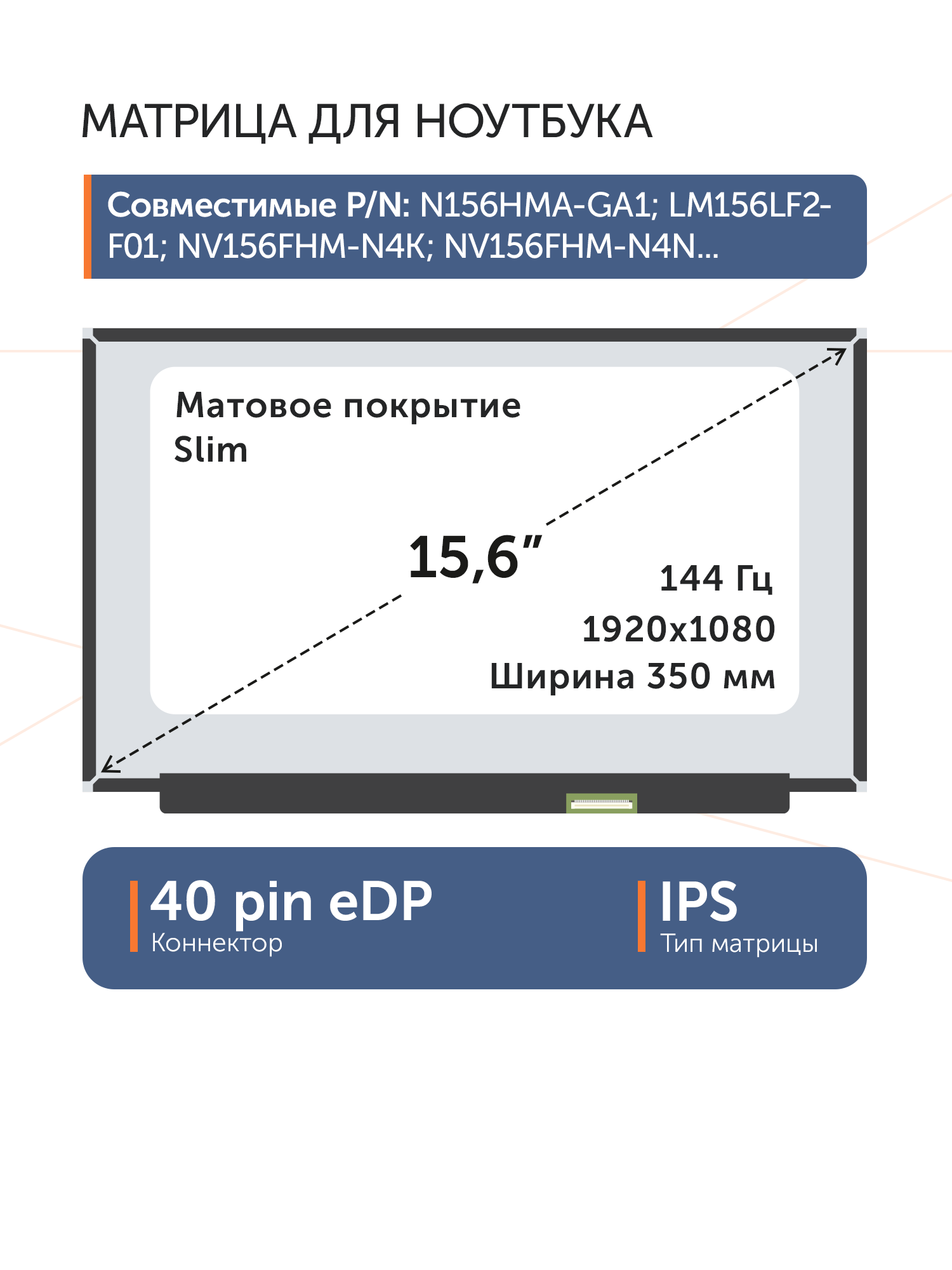Совместимые модели: LM156LF1F02, NV156FHM-NY6, N156HMA-GA1, LP156WFG-SPK1, LP156WFG(SP)(K1), LP156WFG-SPB3, LP156WFG(SP)(B3), LP156WFG-SPF6, LP156WFG(SP)(F6), LP156WFG-SPB4, LP156WFG(SP)(B4)