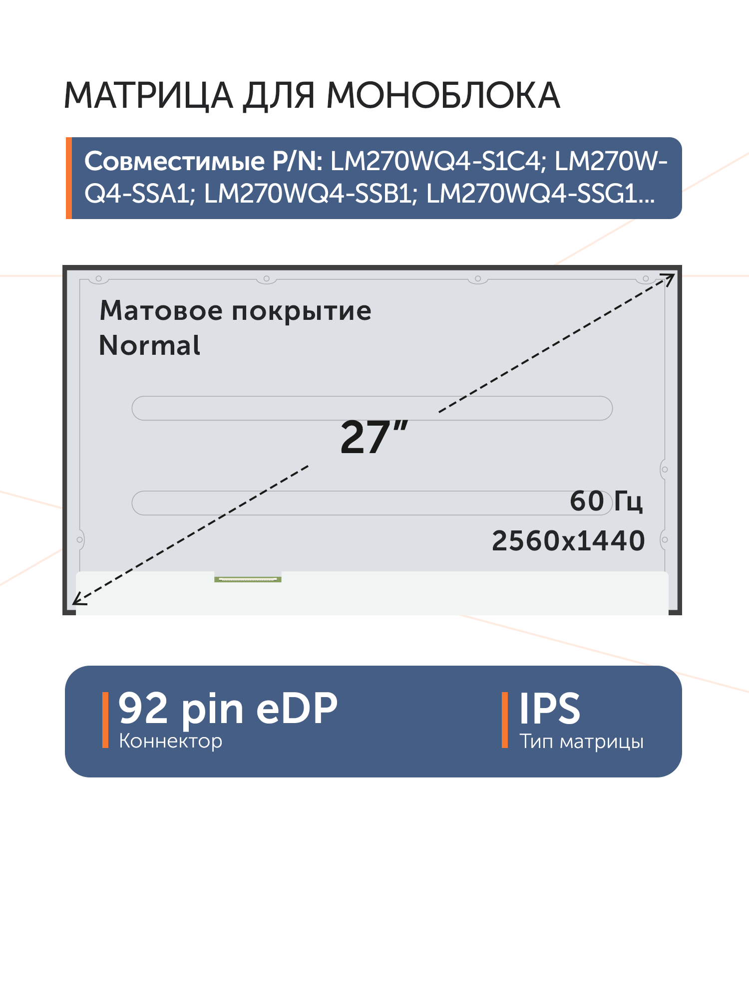 Совместимые модели: LM270WQ4-SSB3, LM270WQ4-SSC1, LM270WQ4-SSB2, LM270WQ4-SSB1, LM270WQ4-SSE2, LM270WQ4-SSA1, LM270WQ4-SSC4