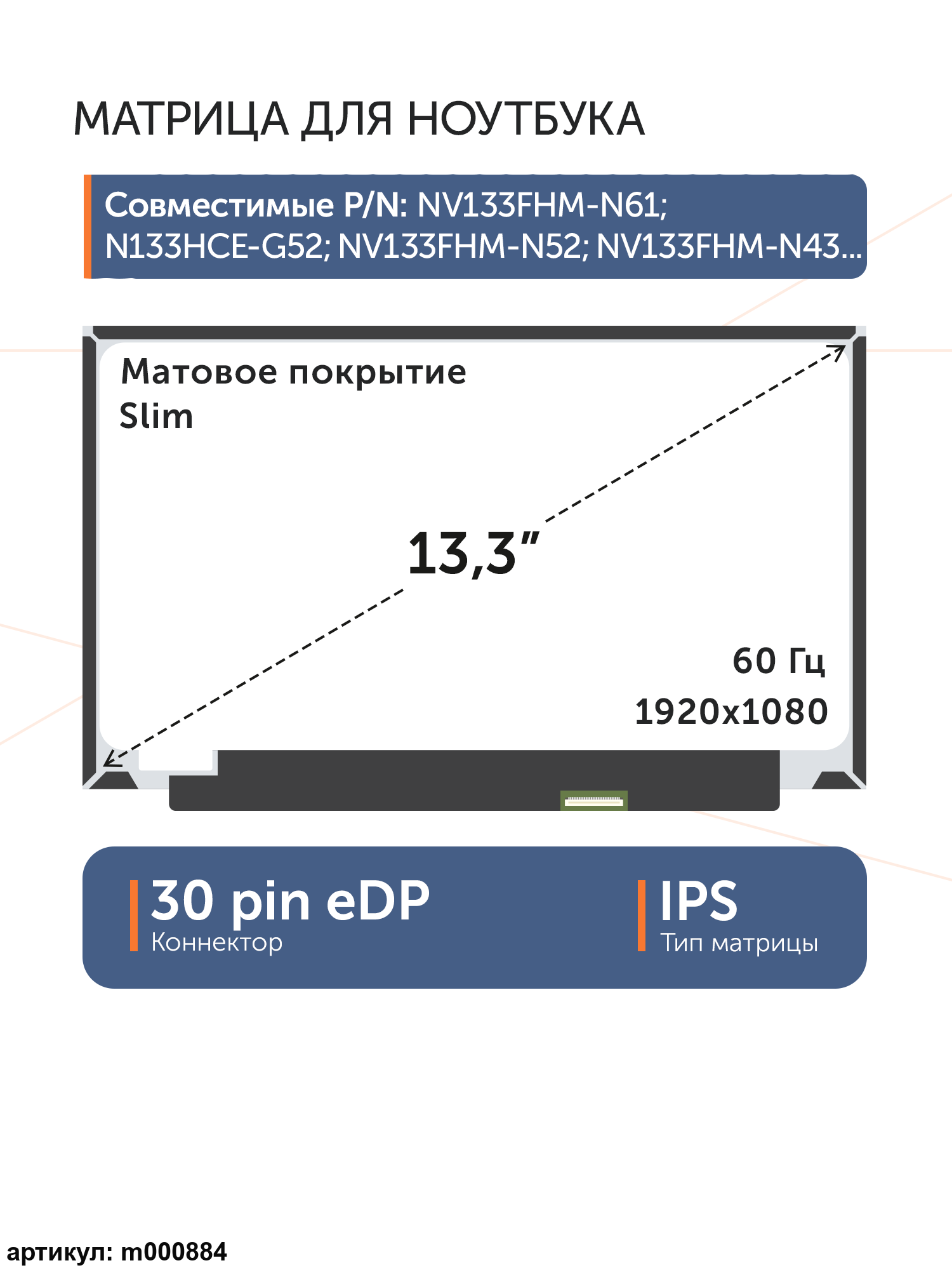 Матрица тонкая (Slim), без креплений.Разъем подключения расположен справа внизу на внешней плате.Совместимые модели: LQ133M1JW02, LM133LF1L01, LM133LF1L02, LTN133HL07