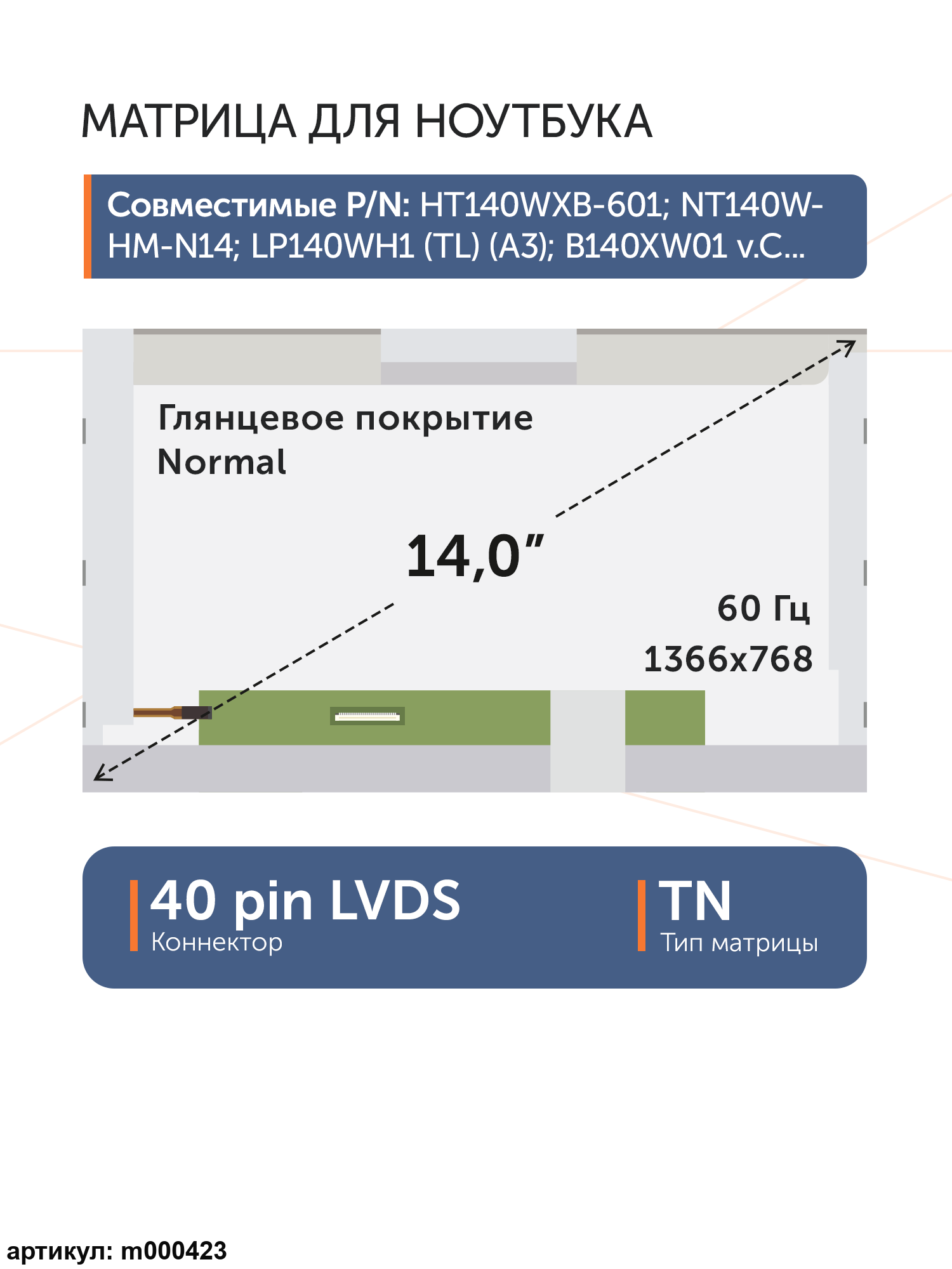 Совместимые модели: HT140WXB-601, NT140WHM-N14, LP140WH1(TL)(A3), B140XW01 v.C, N140BGE-L23 Rev.C1, HT140WXB-101, HT140WXB-100, LP140WH4(TL)(P2), LP140WH4(TL)(P1), N140BGE-L13, LTN140AT16 B01, B140XW01 v.B, LP140WH4(TL)(N2), B140XTN01.3, HB140WX1-200, N140BGE-L23, HSD140PHW3 B00, BT140GW01 v.6, M140NWR2 R2, LP140WH4(TL)(N1), BT140GW01 v.5, BT140GW01 v.0, M140NWR2 R1, BT140GW02 v.5, BT140GW02 v.0, HB140WX1-100, LTN140AT25, LTN140AT24, LTN140AT23, LTN140AT19 201, LTN140AT18 201, LP140WH4(TL)(A2), LTN140AT16, LP140WH5(TL)(Z1), N140BGE-L12, LTN140AT26, N140BGE-L22, LTN140AT22, HT140WXB-501, LP140WH4(TL)(C1), BT140GW01 v.2, N140B6-L01, LP140WH1(TL)(B3), CLAA140WB11A, BT140GW01 v.9, LP140WH4(TL)(B1), LP140WH4(TL)(A1), LTN140AT04 G01, LTN140AT07-L01, HSD140PHW1 A, LTN140AT04, LTN140AT02, LTN140AT01, N140BGE-L21, N140BGE-L11, N140B6-L08, N140B6-L02, LTN140AT07, LP140WH1(TL)(E3), LP140WH1(TL)(E2), LP140WH1(TL)(D6), LP140WH1(TL)(D3), LP140WH1(TL)(C6), LP140WH1(TL)(B1), LP140WH1(TL)(C3), LP140WH1(TL)(A4), LP140WH1(TL)(A2), LP140WH1(TL)(A1), B140XW01 v.9, B140XW01 v.8, B140XW01 v.7, B140XW01 v.6, B140XW01 v.1, B140XW01 v.0, LTN140AT26-L01