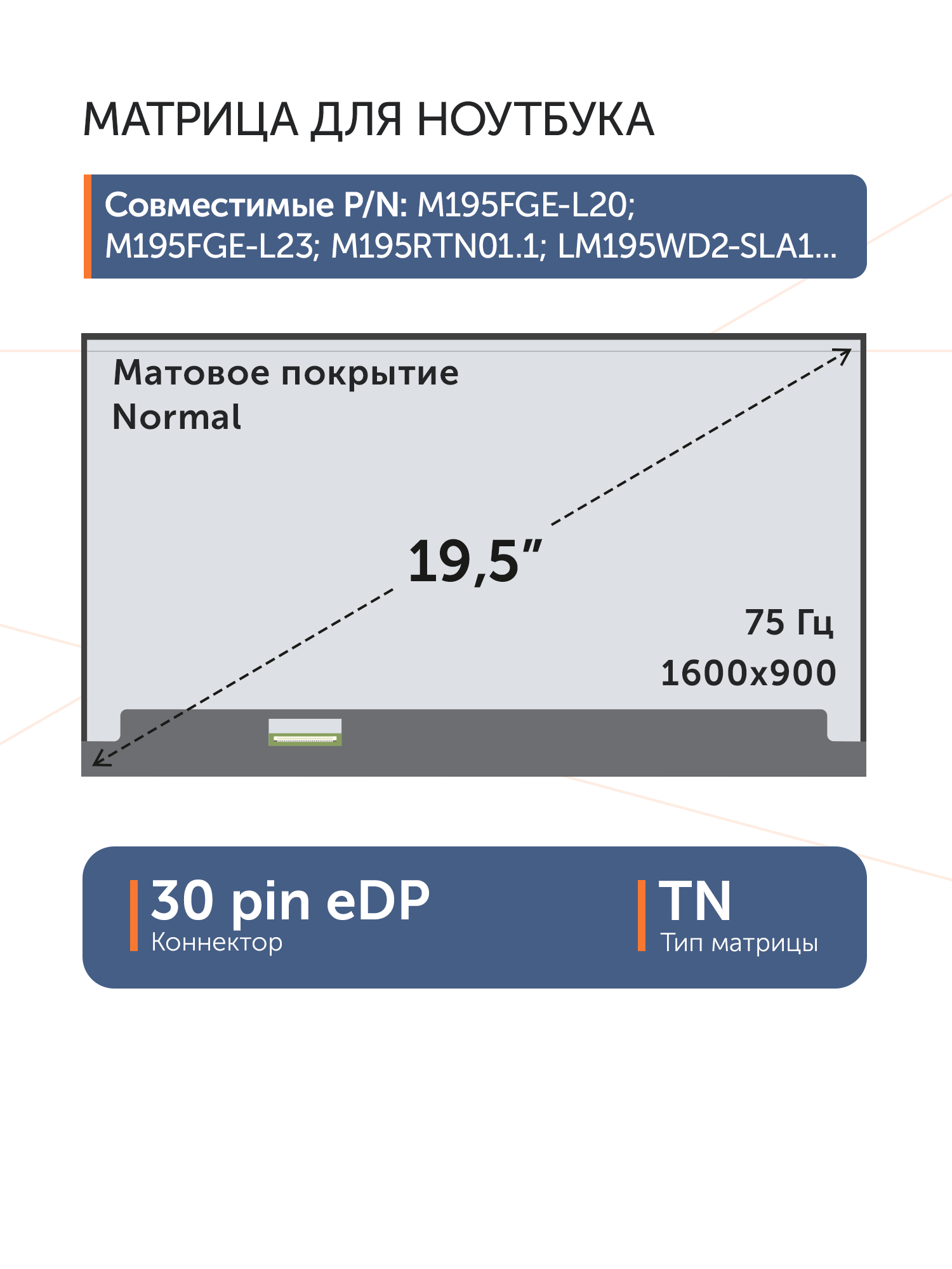 Матрица для моноблокаРасположение разъема сверху справа.Совместимые модели: M195FGE-L20, M195FGE-L23, M195RTN01.0, M195RTN01.1
