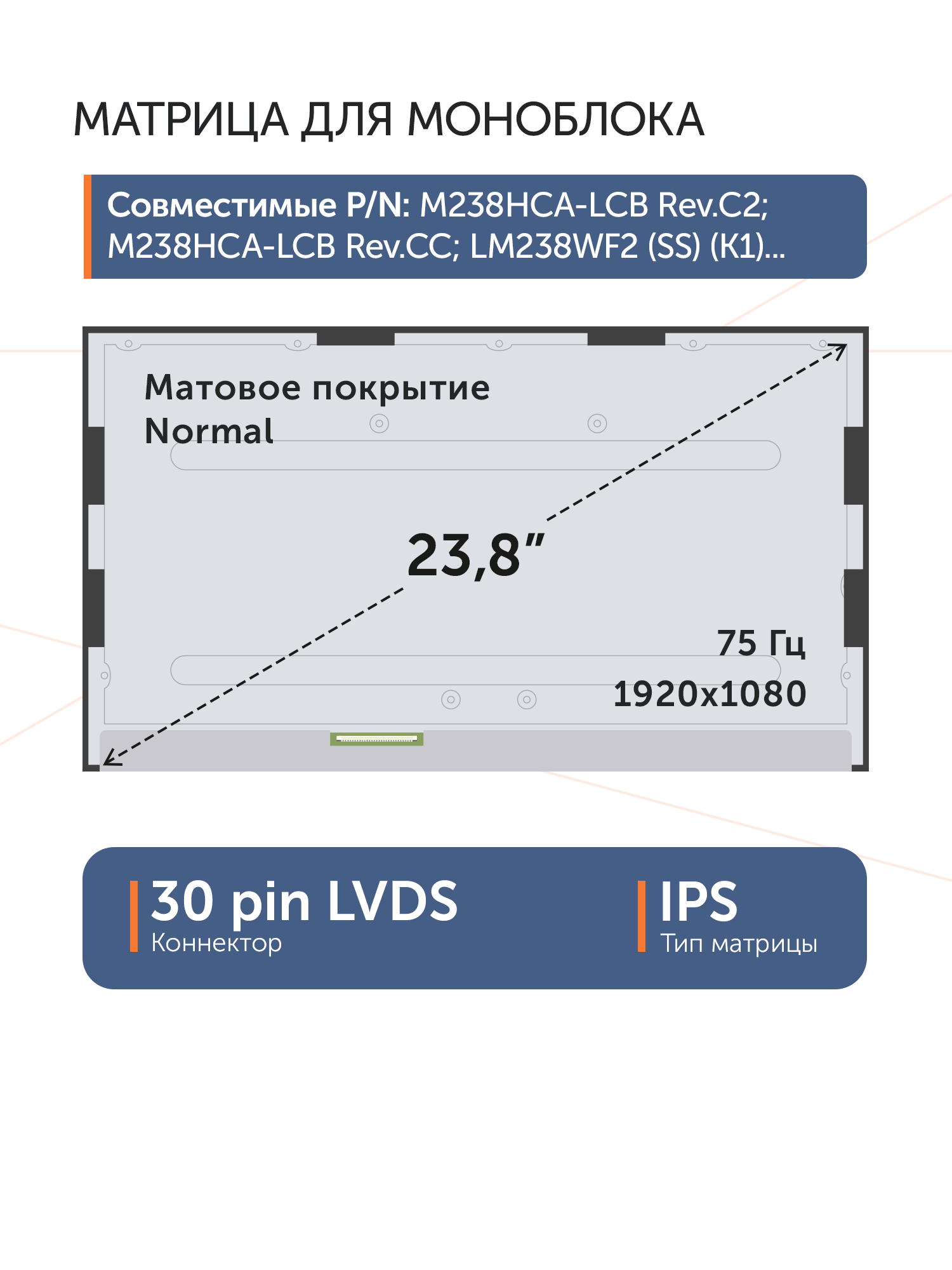 Совместимые модели: MV238FHM-N20, LM238WF2-SJF1, LM238WF2-SLK1, LM238WF2-SSA1, LM238WF2-SSC1, LM238WF2-SSD1, LM238WF2-SSE1, LM238WF2-SSF1, LM238WF2-SSF2, LM238WF2-SSG1, LM238WF2-SSG2, LM238WF2-SSG3, LM238WF2-SSK1, LM238WF2-SSL1, LM238WF2-SSM1, LTM238HL04, LTM238HL06, M238HCA-L3B Rev.C2, M238HCA-L3B Rev.C1, LM238WF2(SS)(P1), M238HCR-L3B, LM238WF2(SS)(M1), LM238WF2(SS)(M3), LM238WF2(SS)(K3), LM238WF2(SS)(K1), M238HCA-L3B, M238HCA-L3B REV.C2, M238HCA-L3B REV.C4