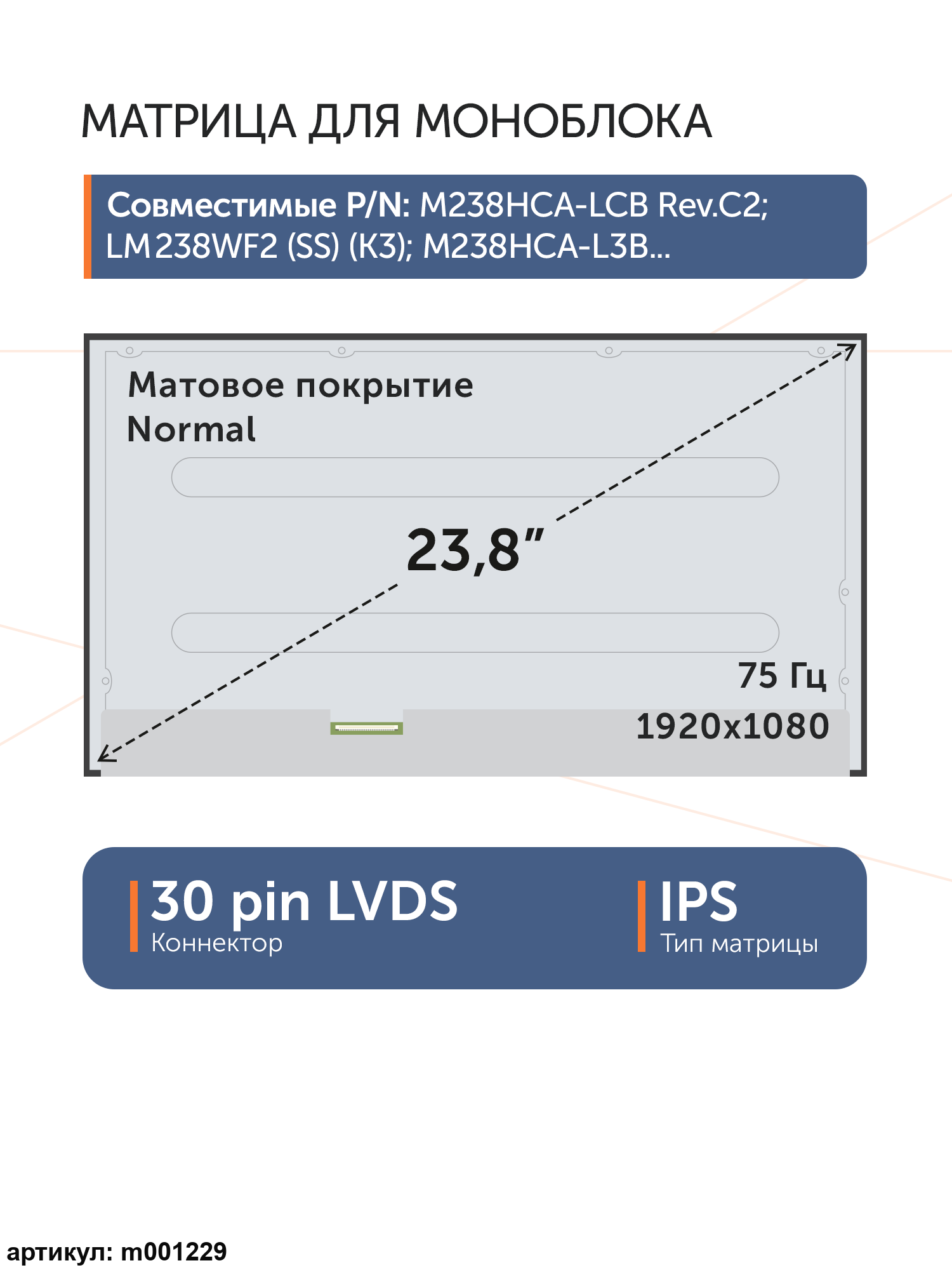Матрица стандарт (normal)Разъем расположен снизу слева.Совместимые P/N: M238HCA-LCB Rev.CC, M238HCA-LCB Rev.CB, M238HCA-LCB Rev.C2, M238HCA-LCB