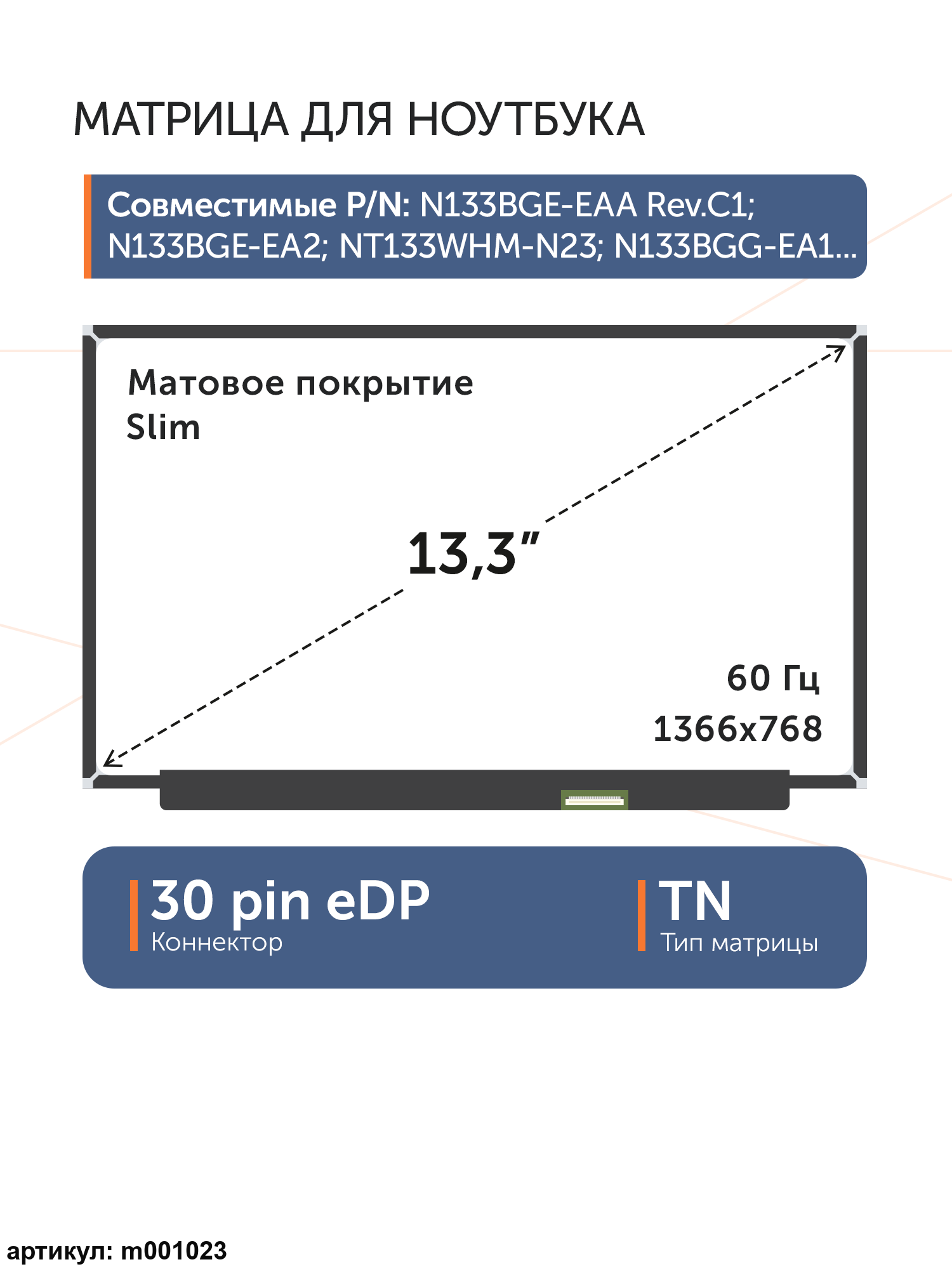 Матрица тонкая (Slim), без креплений.Разъем подключения расположен справа внизу на внешней плате.Тип матрицы: TNСовместимые модели: N133BGE-EAA Rev.C1, N133BGE-EA2, NT133WHM-N23, N133BGG-EA1, N133BGE-EB1