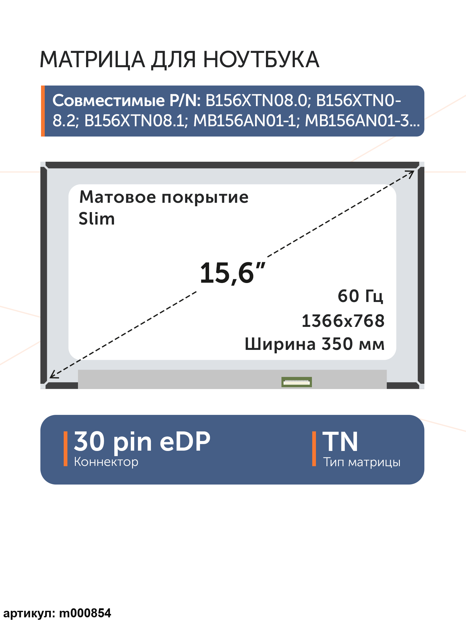 Совместима с: N156BGA-E53 Rev.C1, B156XTN08.2, NT156WHM-N4T, NT156WHM-N46
