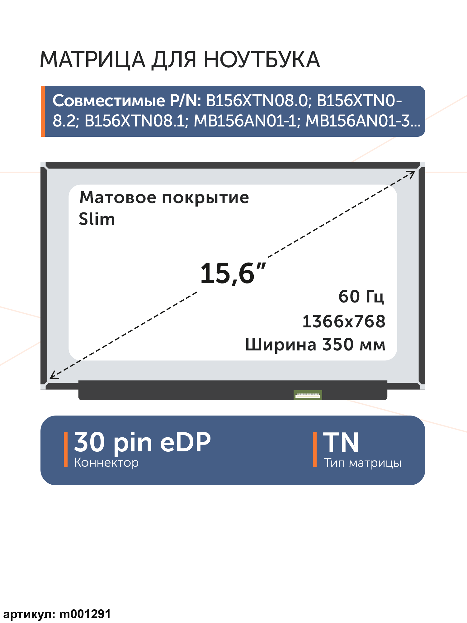 Совместимые модели: B156XW04 V.7, LTN156AT31, B156XN03.5, B156XN03.1, N156BGE-EB1 Rev.C1, N156BGE-EA1, NT156WHM-N12, N156BGE-EB1 Rev.C2, LTN156AT39, LP156WHB (TP)(C2), LP156WHB-TPC2, LP156WHB (TP)(A1), LP156WHB-TPA1, N156BGE-EA2 Rev.B1, B156XTN07.0, N156BGA-EB2 Rev.C1, NT156WHM-N32, N156BGE-E32 Rev.C1, LP156WHU (TP)(A1), LP156WHU-TPA1, LP156WHB (TP)(GA), LP156WHB-TPGA, LP156WHB (TP)(L1), LP156WHB-TPL1, LP156WHB (TP)(K1), LP156WHB-TPK1, LP156WHU (TP)(E1), LP156WHU-TPE1, LP156WHB (TP)(GB), LP156WHB-TPGB, NT156WHM-N22, N156BGE-EA2 Rev.C1, LTN156AT33, B156XTN04.0, NT156WHM-N32 V.8, B156XTN04.6, LP156WHU (TP)(G1), LP156WHU-TPG1, B156XTN07.1, N156BGA-EA2 Rev.C1, N156BGE-E31 Rev.C1, NT156WHM-N42 V8.1, NT156WHM-N42 V8.2, NT156WHM-N42, NT156WHM-N32 V8.2, N156BGA-EA3 Rev.C4