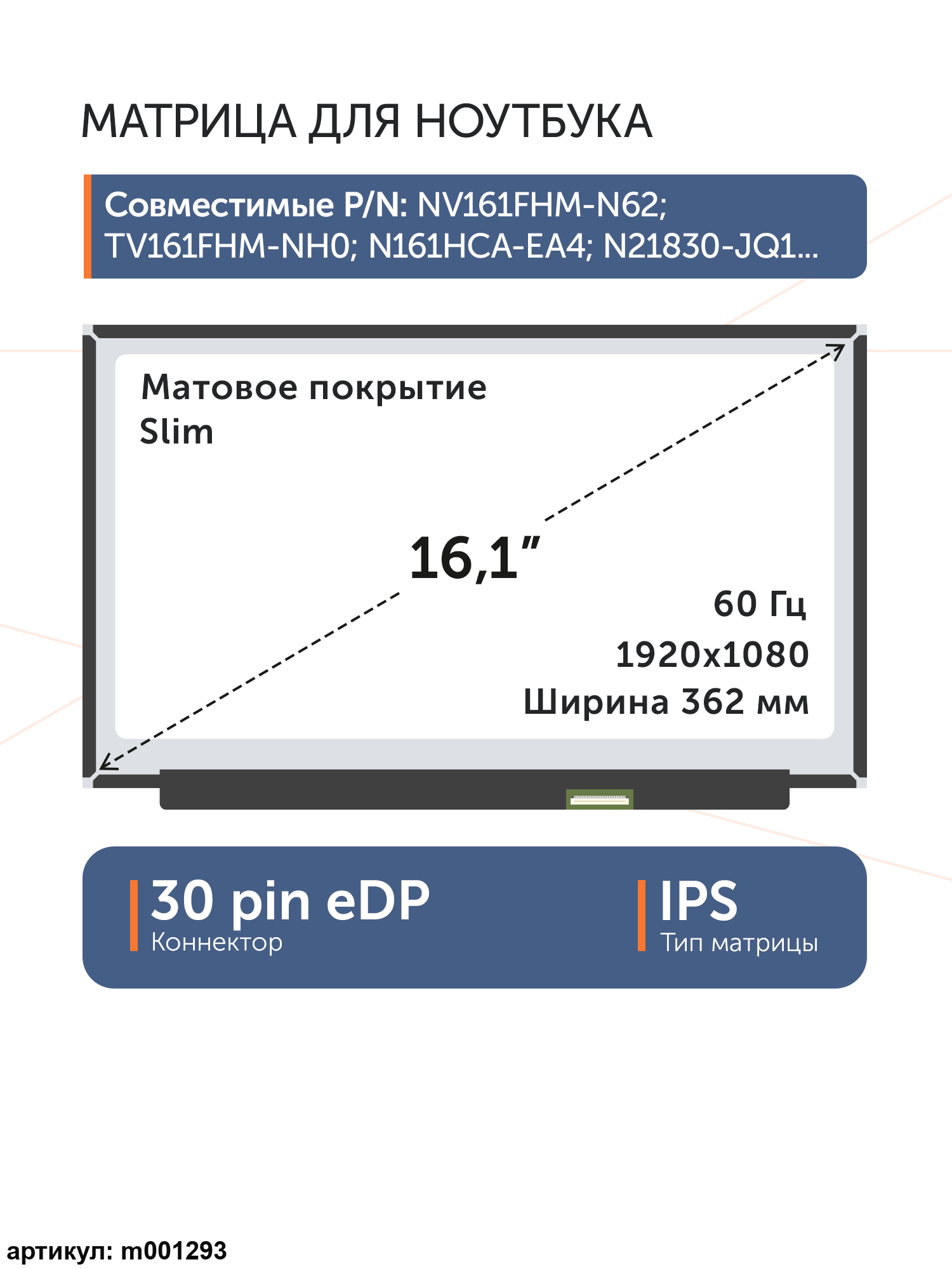 Матрица тонкая (slim), без креплений.Разъем расположен снизу справа на внешней плате.Совместимые модели: N161HCA-EA2, N161HCA-EA3, N161HCA-EAC, NV161FHM-N41, NV161FHM-N61, TV161FHM-NH0