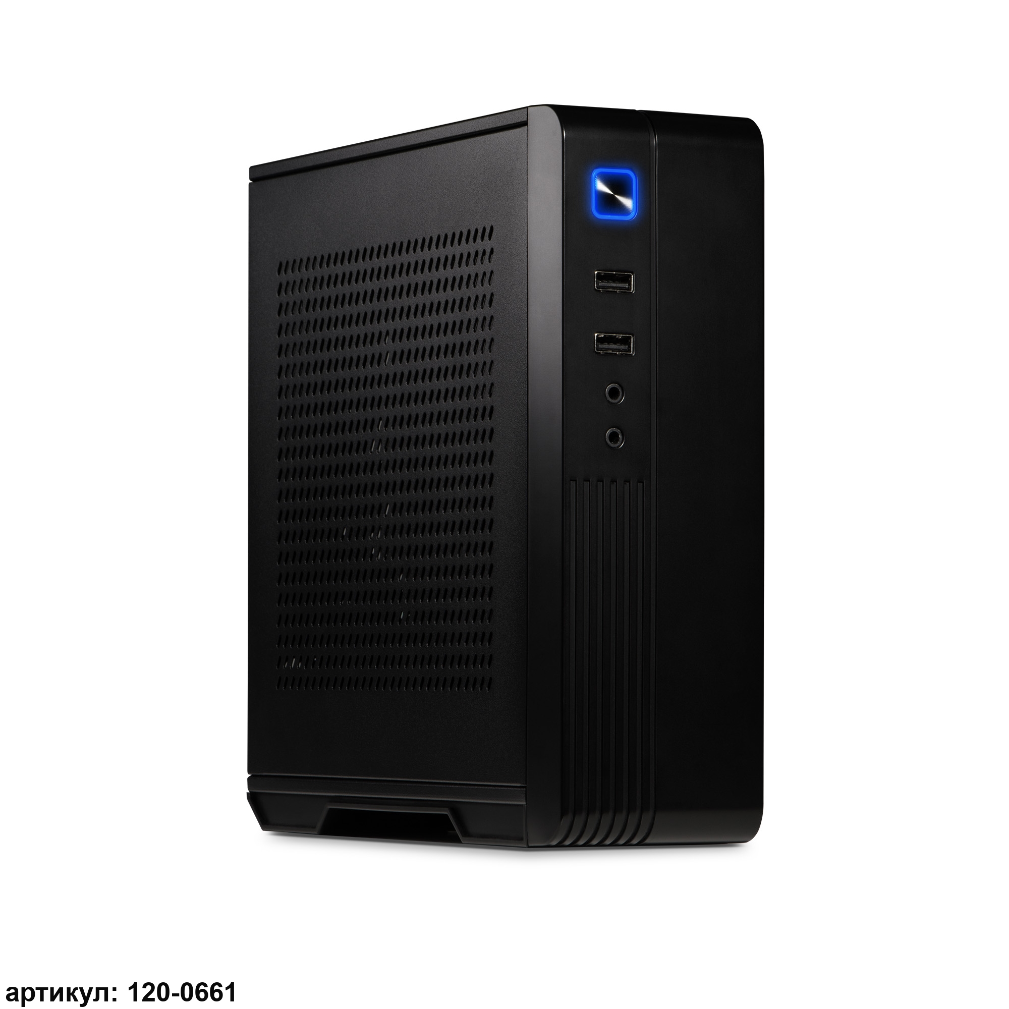 Черный металлический корпус вертикального типа отличается изысканным и современным дизайном, который подойдет для использования как в корпоративной, так и домашней среде. На его фронтальной части имеется несколько USB-портов, через которые осуществляется быстрое подключение без лишних манипуляций. Там же расположены гнезда для подключения микрофона и наушников. Боковая часть корпуса перфорирована, что обеспечивает вентиляцию и помогает компонентам эффективно охлаждаться.