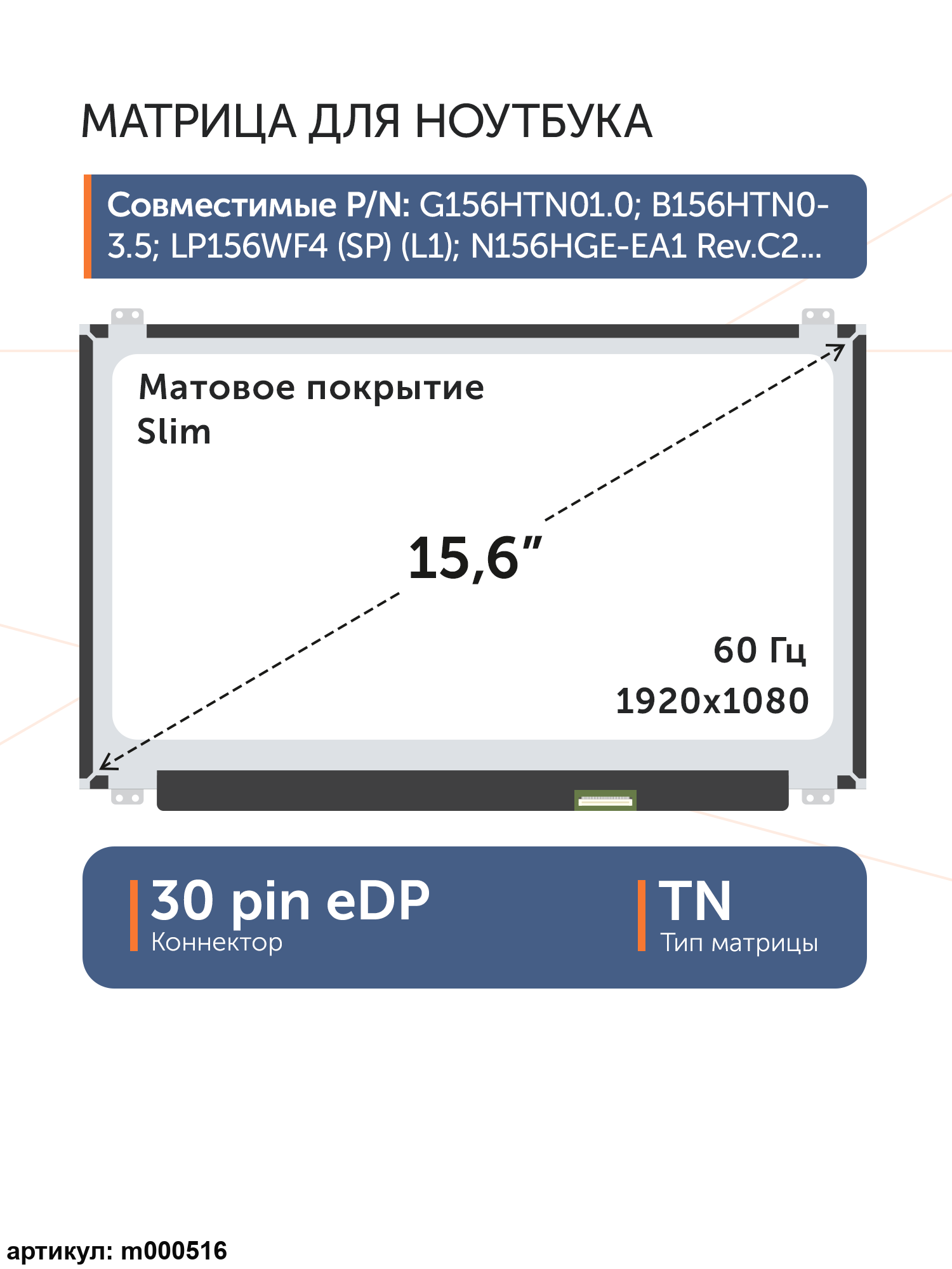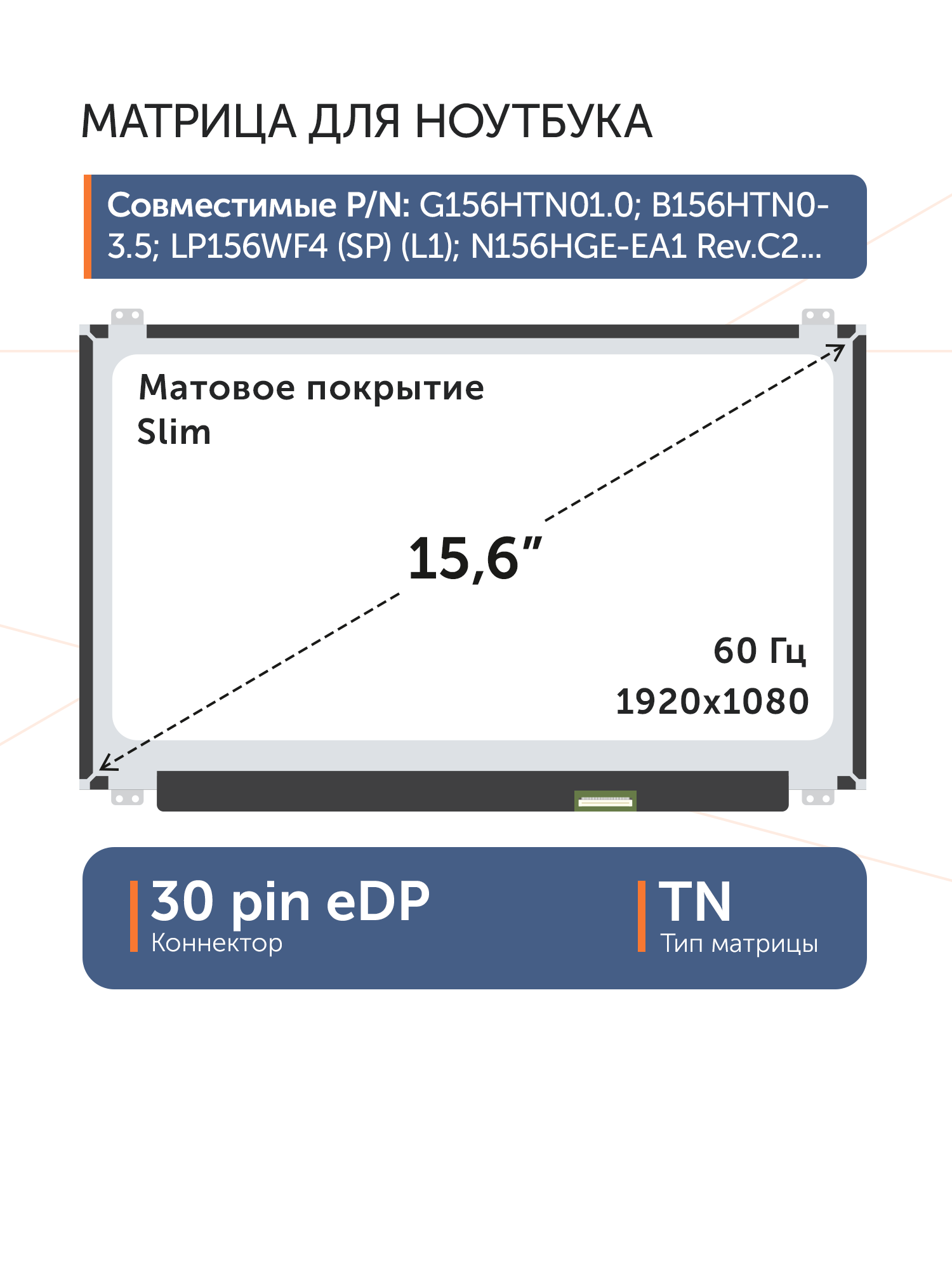 Совместимые модели: G156HTN01.0, B156HTN03.5, LP156WF4 (SP)(L1), N156HGE-EA1 Rev.C2, B156HTN03.1, NT156FHM-N31, B156HTN03.9, NT156FHM-N41 V8.2, B156HTN03.8, N156HGA-EAB, N156HGE-EAL, N156HGE-EAB, HB156FH1-301, N156HGA-EAL, N156HGE-EBB, N156HGE-EA1, N156HGA-EBB, B156HTN03.7, B156HTN03.6, N156HGE-EA2, B156HTN03.0, B156HTN03.4, HB156FH1-402, HB156FH1-401, N156HGE-EG1, N156HGE-EBL, N156HGE-EB1, NT156FHM-N41