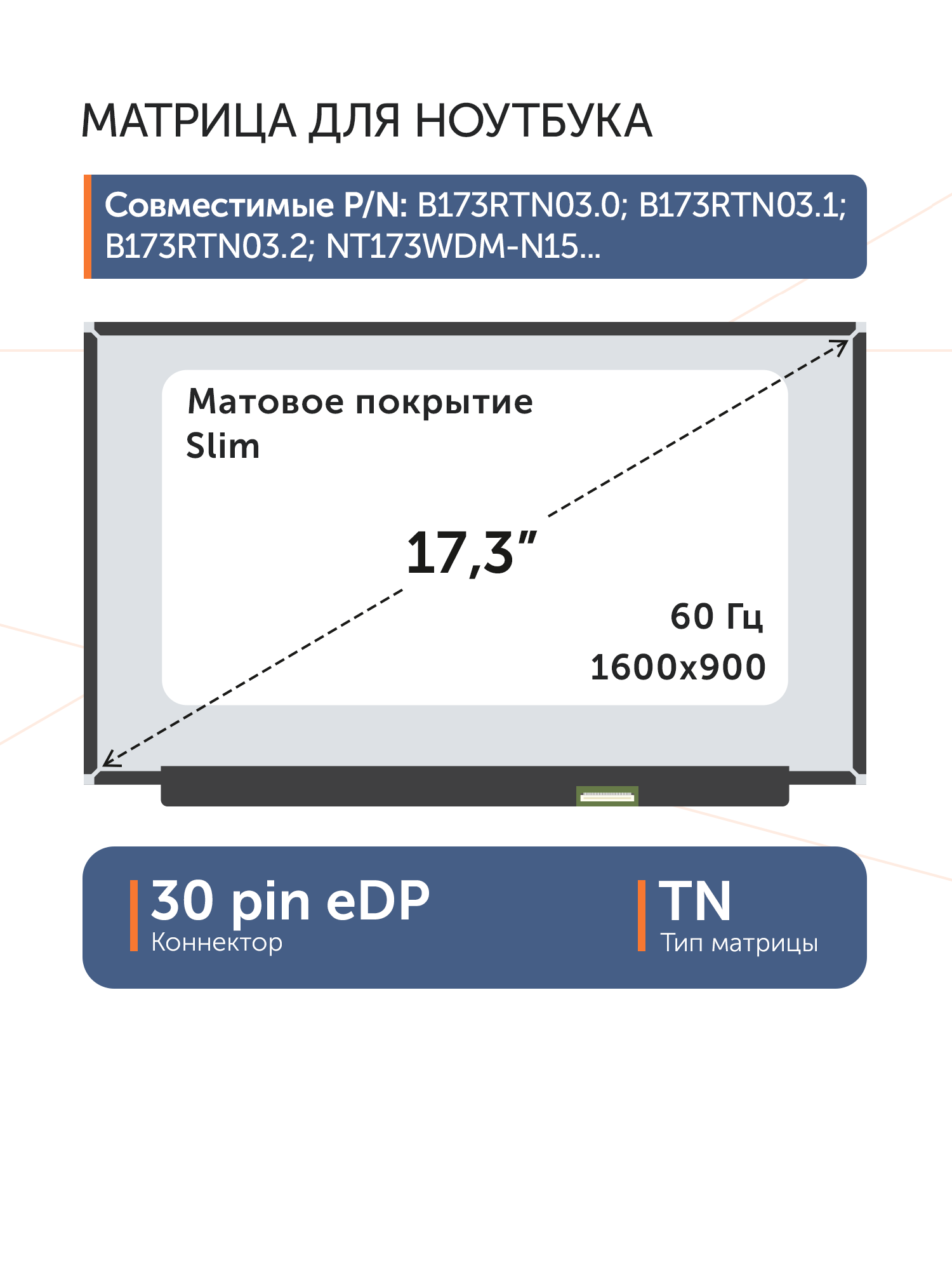 Совместимые модели: NT173WDM-N15, NT173WDM-N24, B173RTN03.1, B173RTN03.0, NT173WDM-N25, NT173WDM-N23