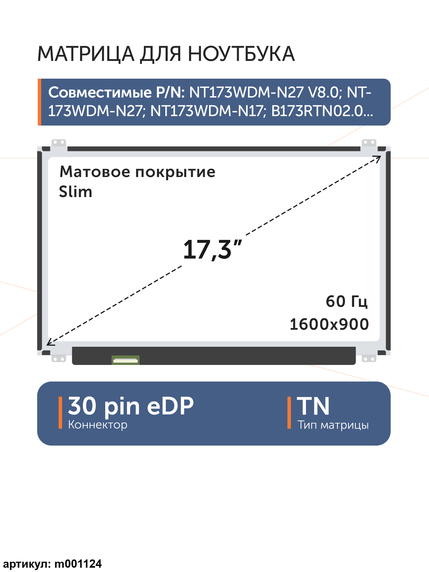 Совместимые модели: NT173WDM-N27 V8.0, NT173WDM-N27, NT173WDM-N17, B173RTN02.0, B173RTN02.1, N173FGA-E44, LTN173KT04-301, B173RTN02.2, NT173WDM-N11, N173FGA-E34 rev.C1, NT173WDM-N21
