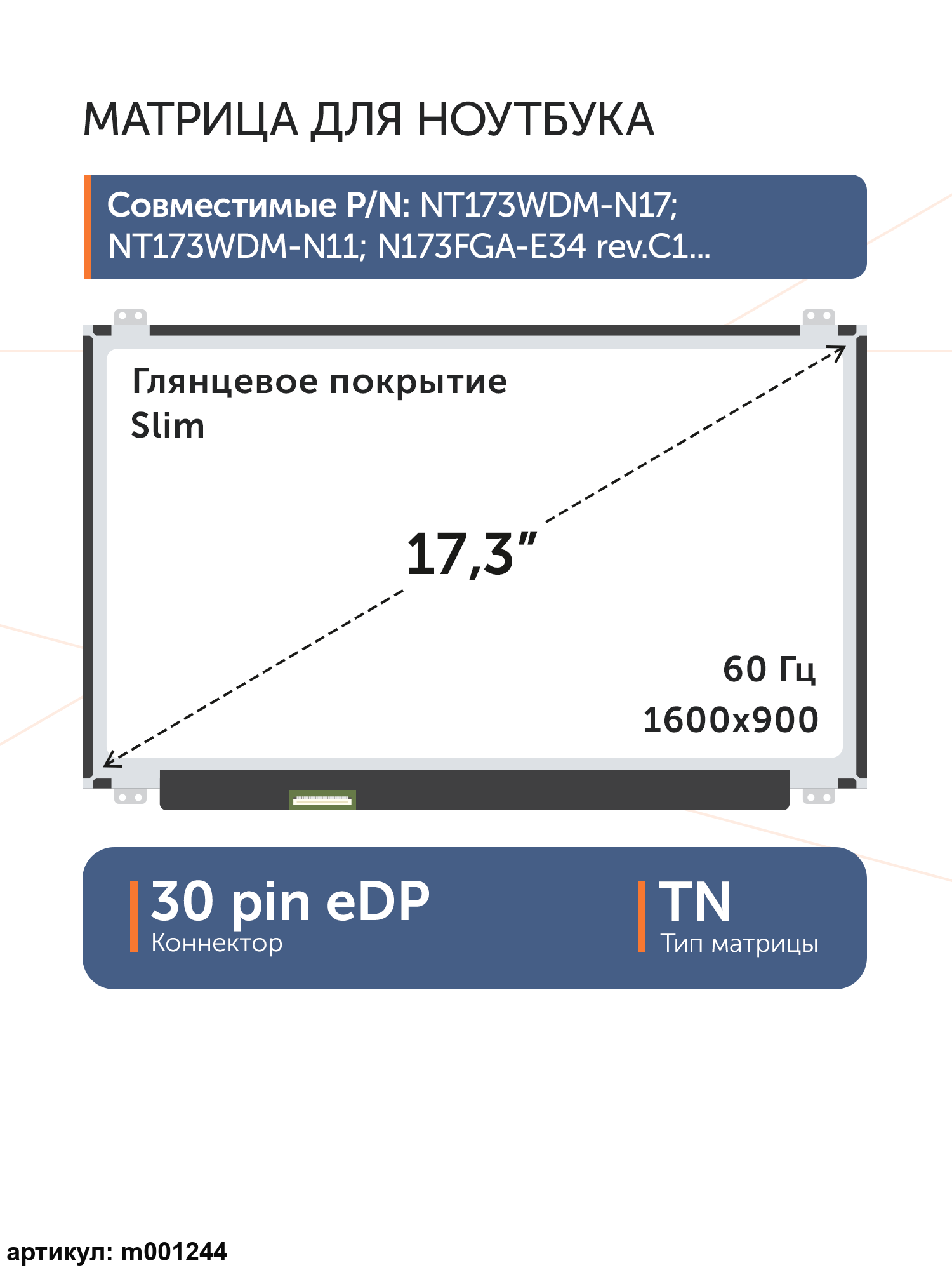 Совместимые модели: NT173WDM-N27 V8.0, NT173WDM-N27, NT173WDM-N17, B173RTN02.0, B173RTN02.1, N173FGA-E44, LTN173KT04-301, B173RTN02.2, NT173WDM-N11, N173FGA-E34 rev.C1, NT173WDM-N21